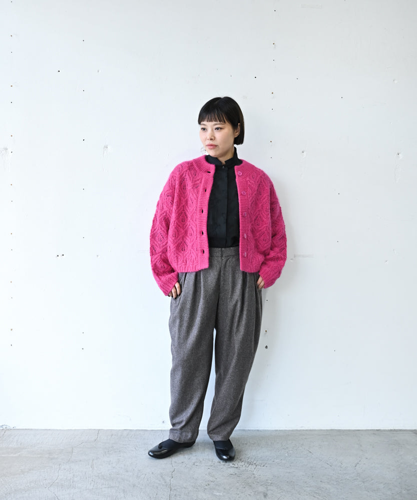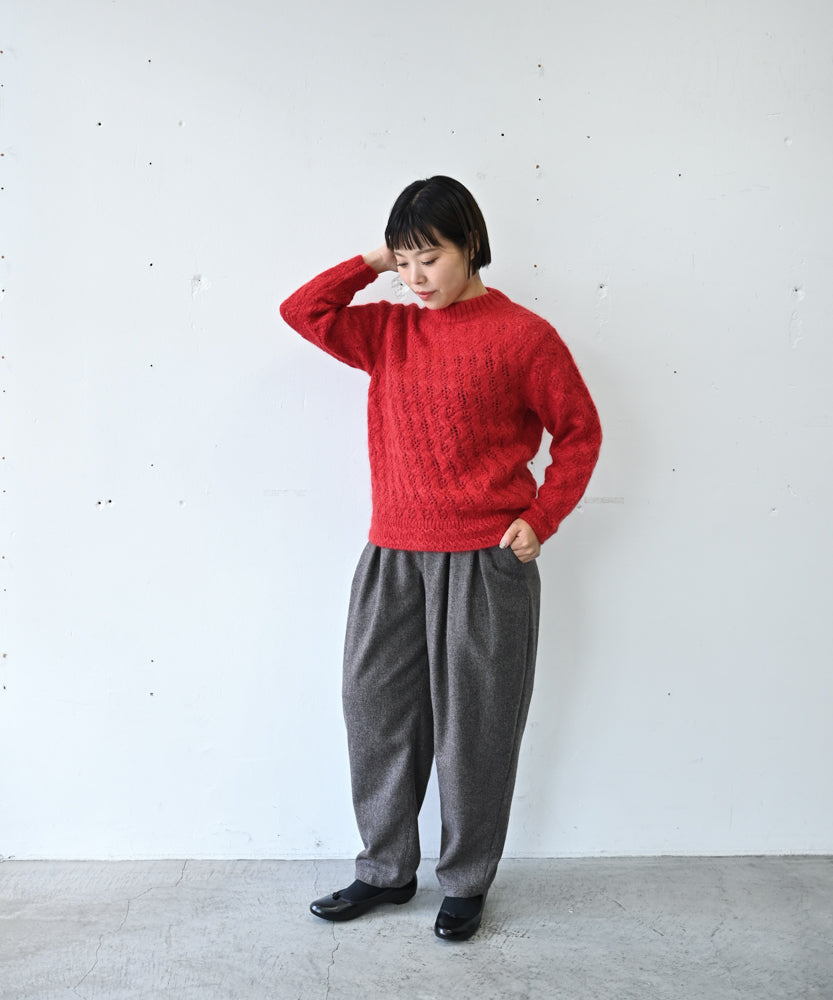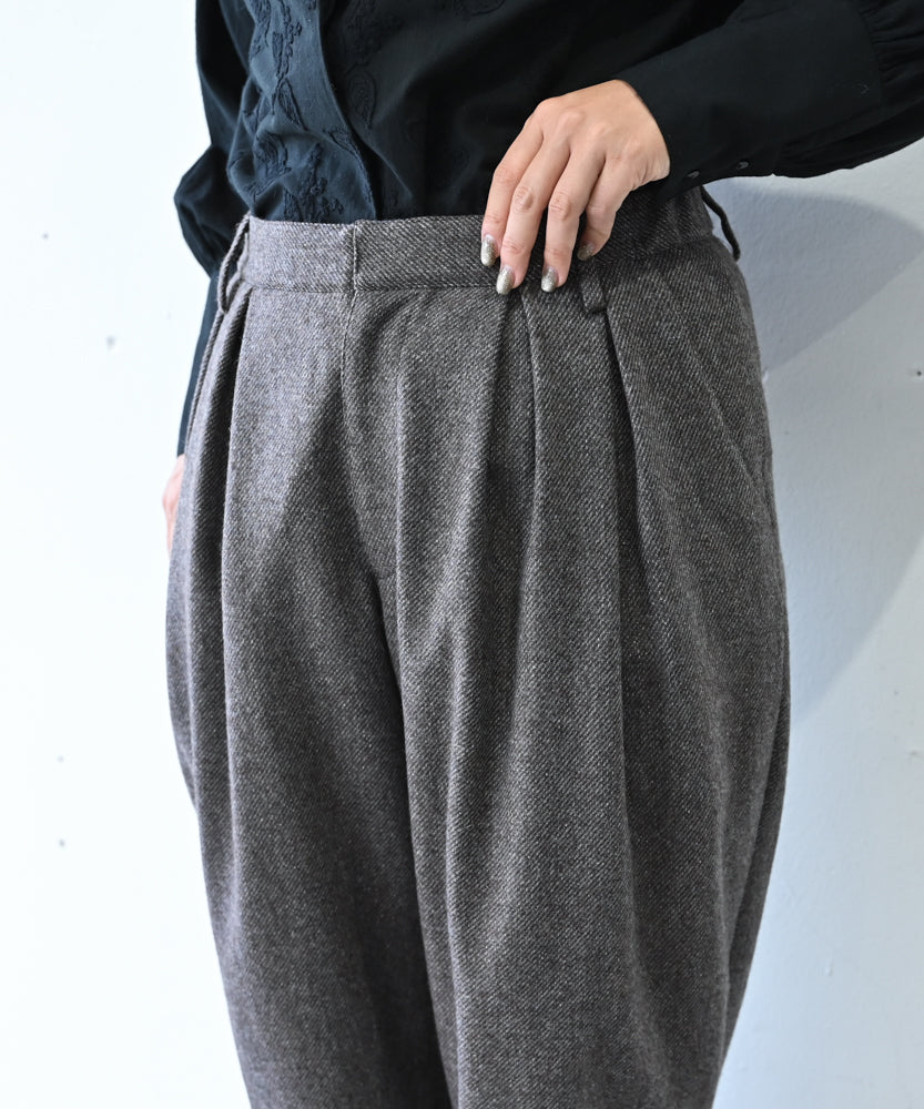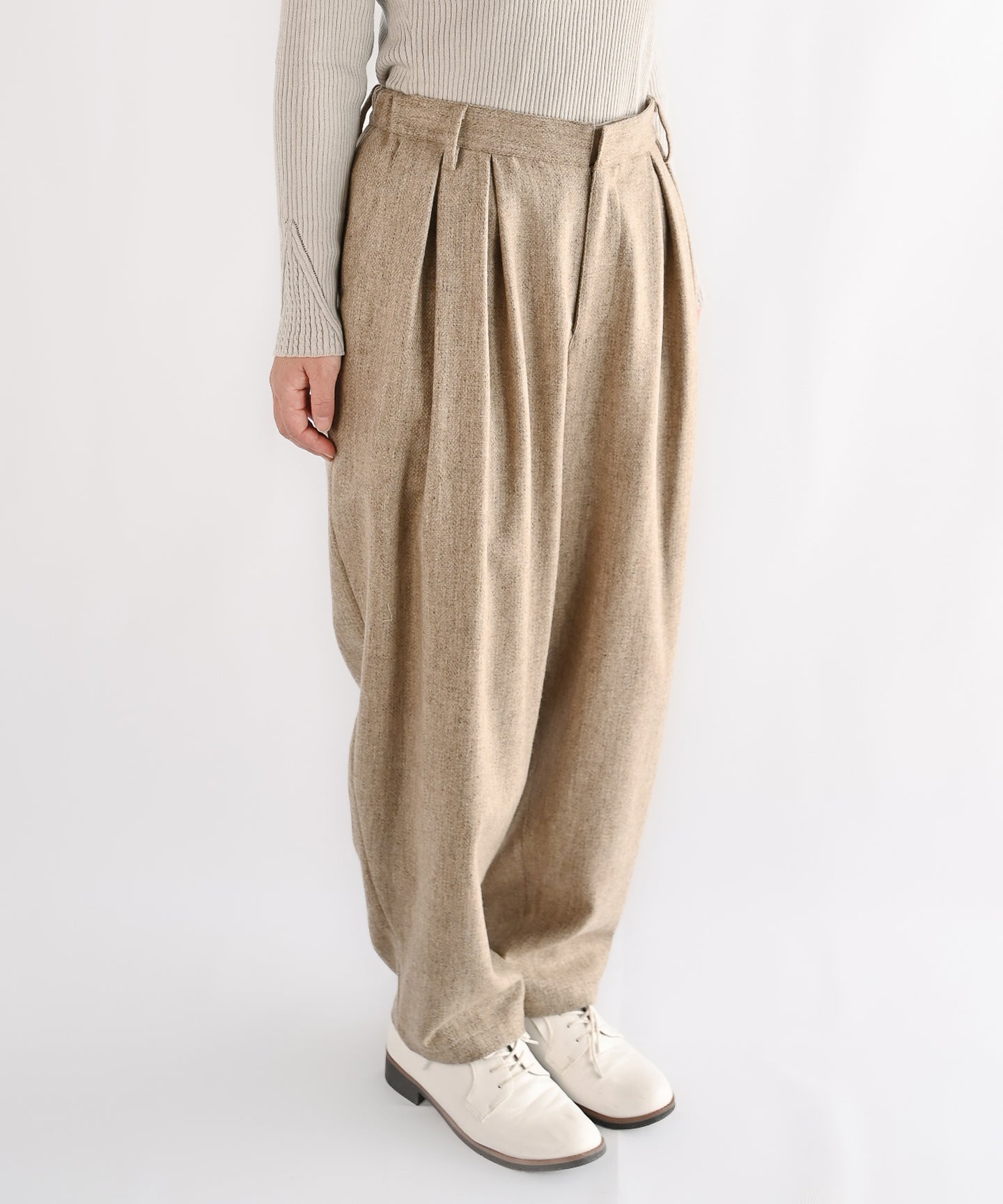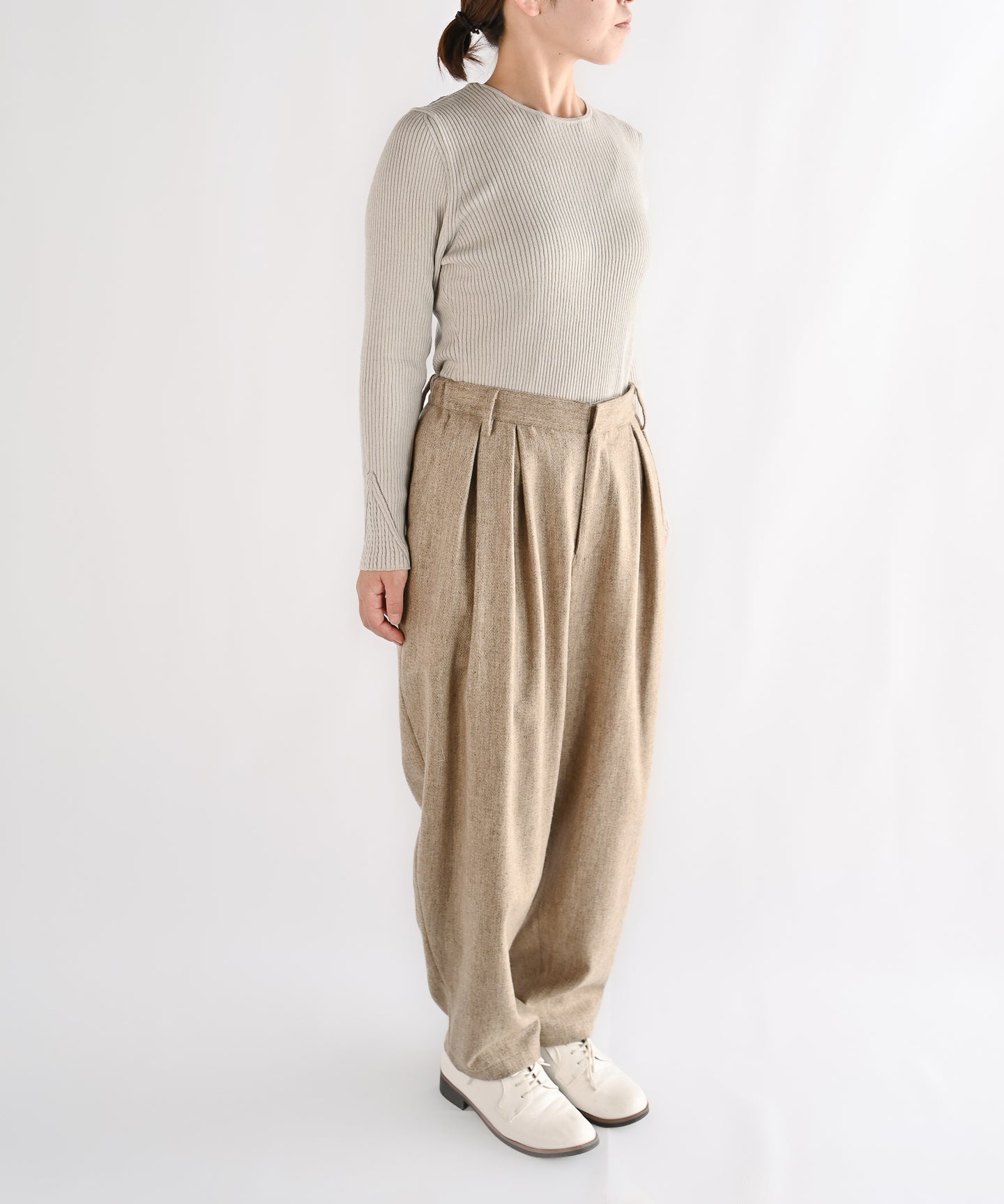 上質なウールと、スーツやスポーツウエアなどにも広く使われている素材ポリエステルを混ぜた、機能性が高い生地を使ったパンツです。強度や速乾性があるポリエステルとウールの天然の光沢感や保温性を兼ね備えています。ロングシーズン快適な着心地です。シンプルながらも洗練されたデザインで、デイリーにはもちろん、お食事会やオフィスシーンなどにもお勧めです。