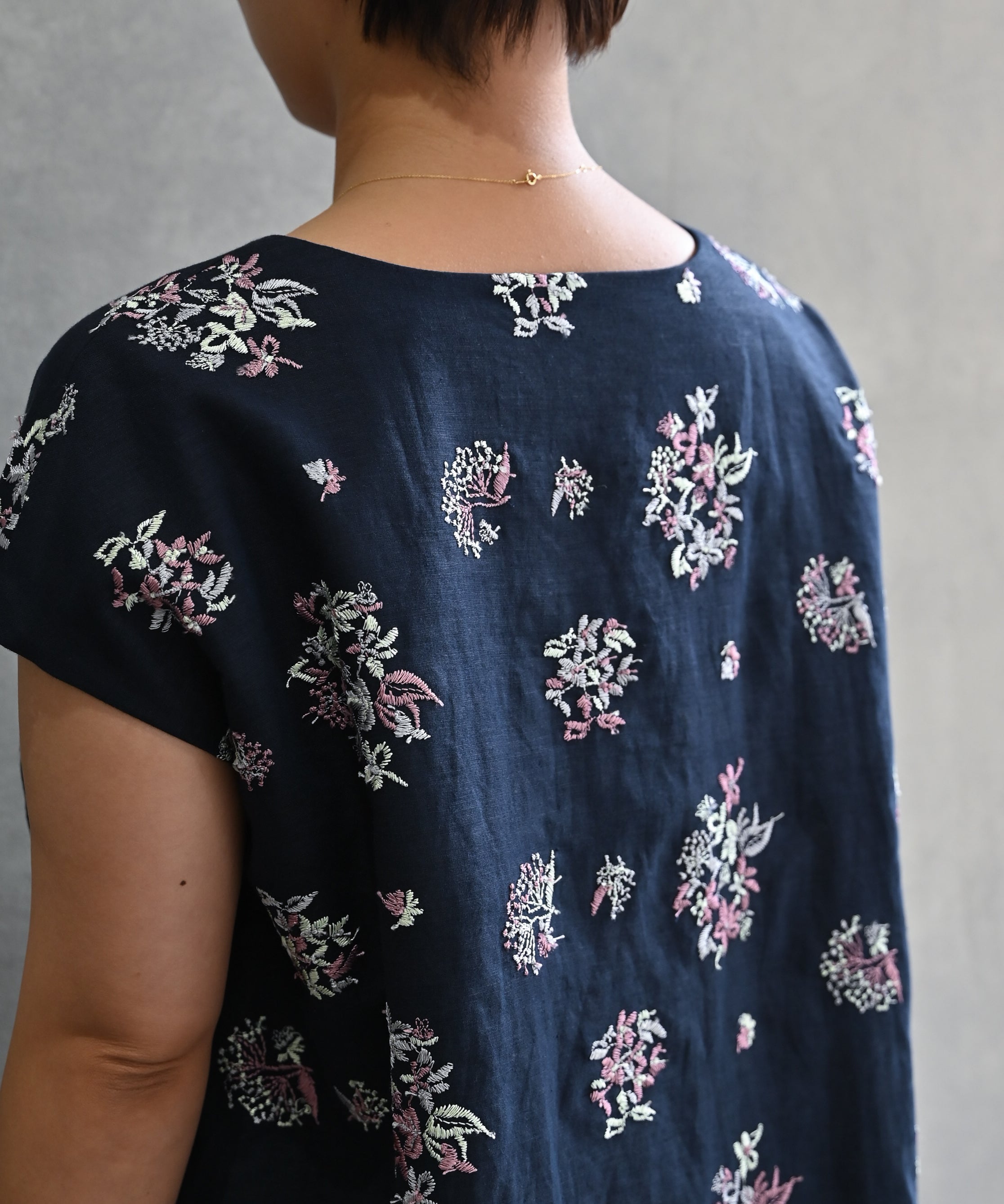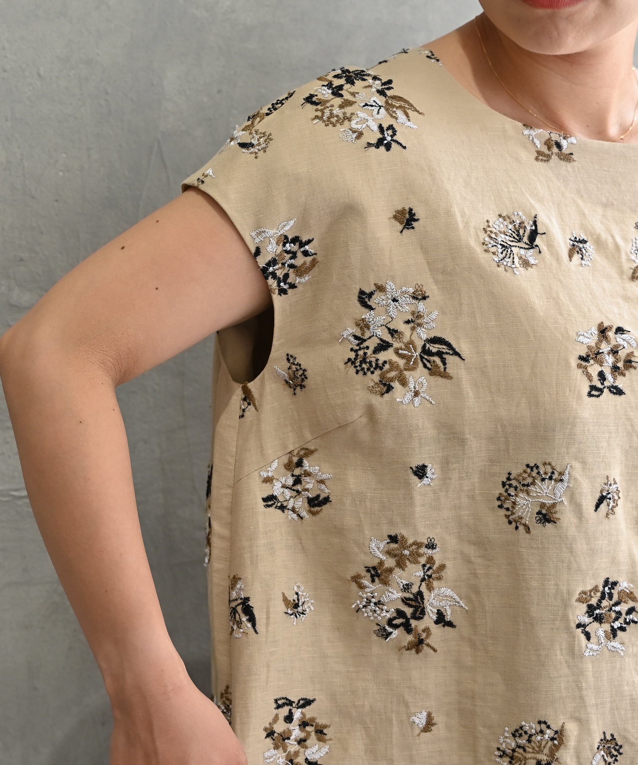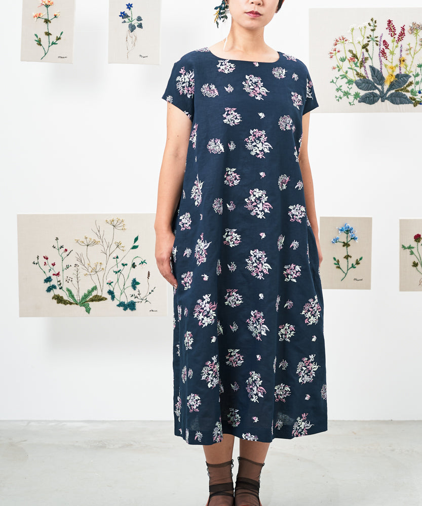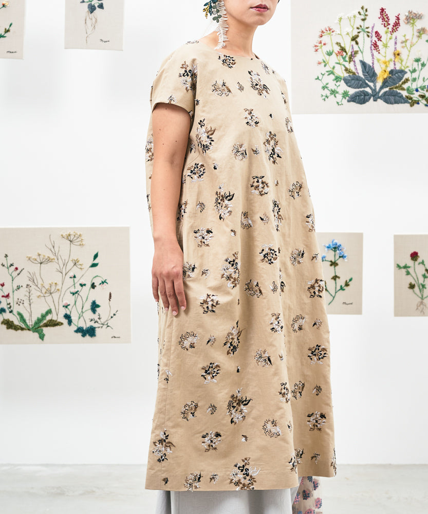 〈遠州織物 コットンリネン〉野小花刺繍 フレンチスリーブワンピース (muh603)