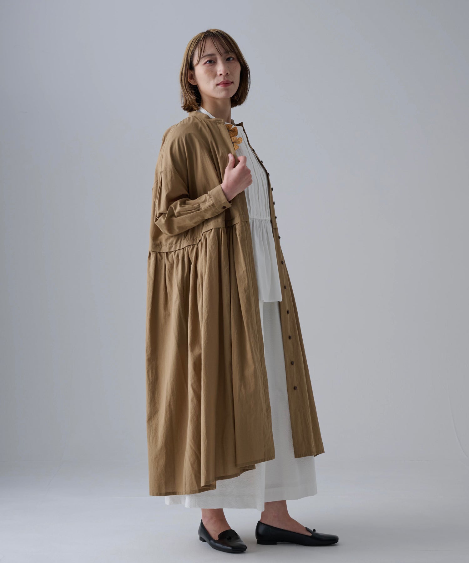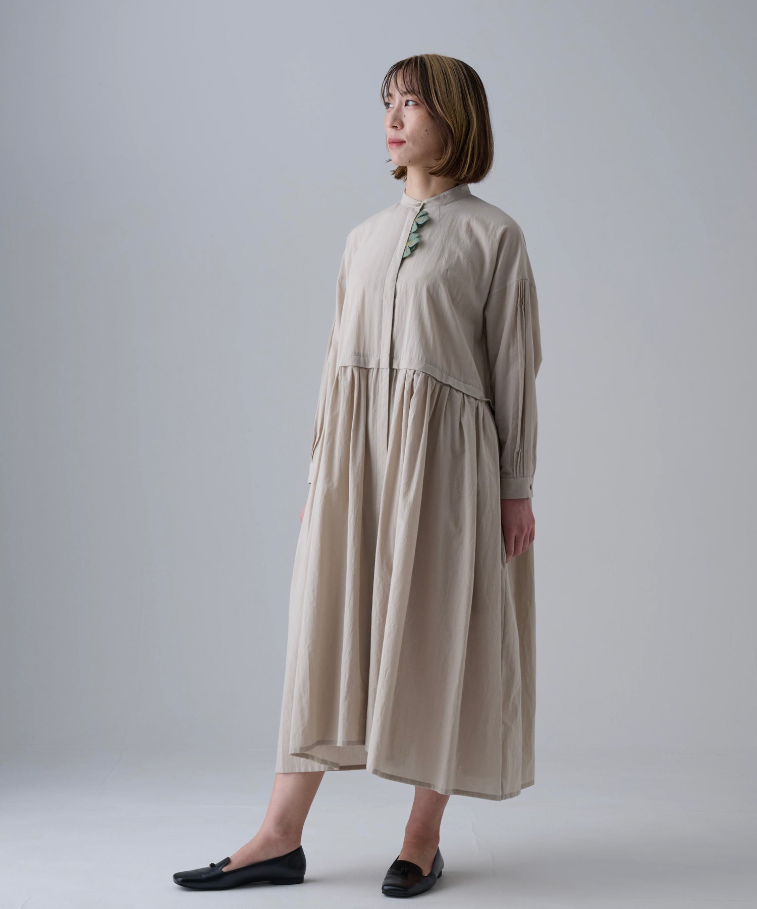 このワンピースはそんなローン生地特有の、まるでコットンのやさしさを直に感じるような、ナチュラルな質感をいかしたデザインです。この生地感とこの形の相性はたいへん良いです。とても着心地が良いので、1枚で着るのはもちろん、日常的にサラッと羽織ってすごすのもオススメです。