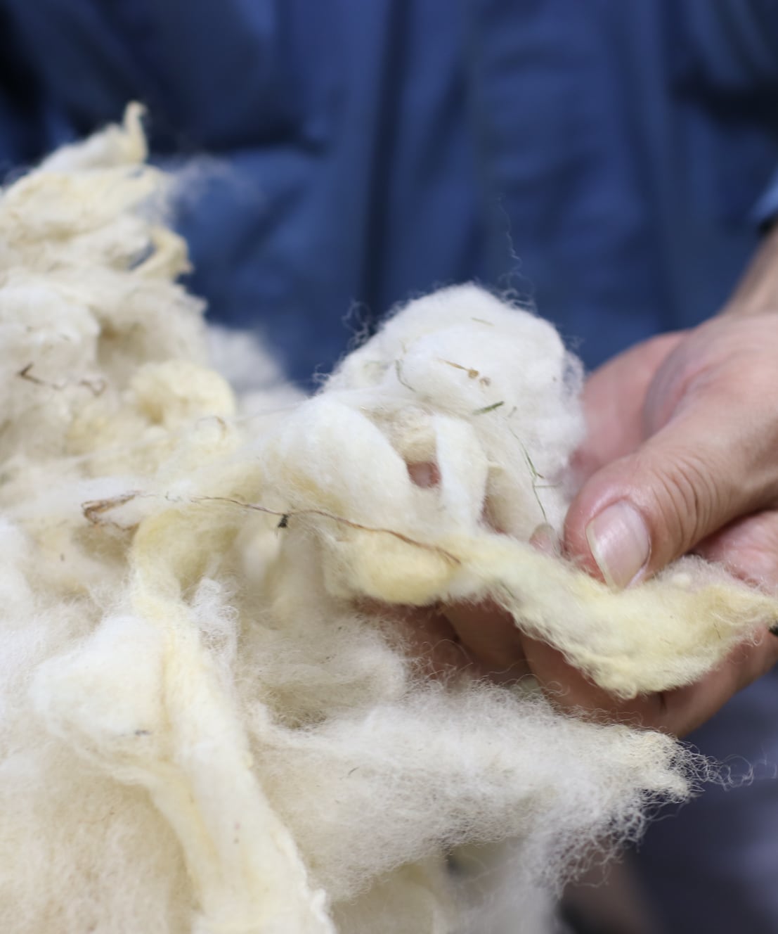 国産羊毛はハリとコシが強い特長があるため、オーストラリアのメリノウール70%をブレンドすることで、編みやすく、セーターなどのアイテムを作りやすい風合いに仕上げました。