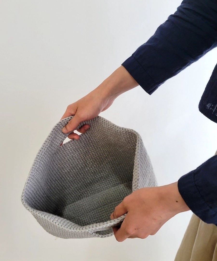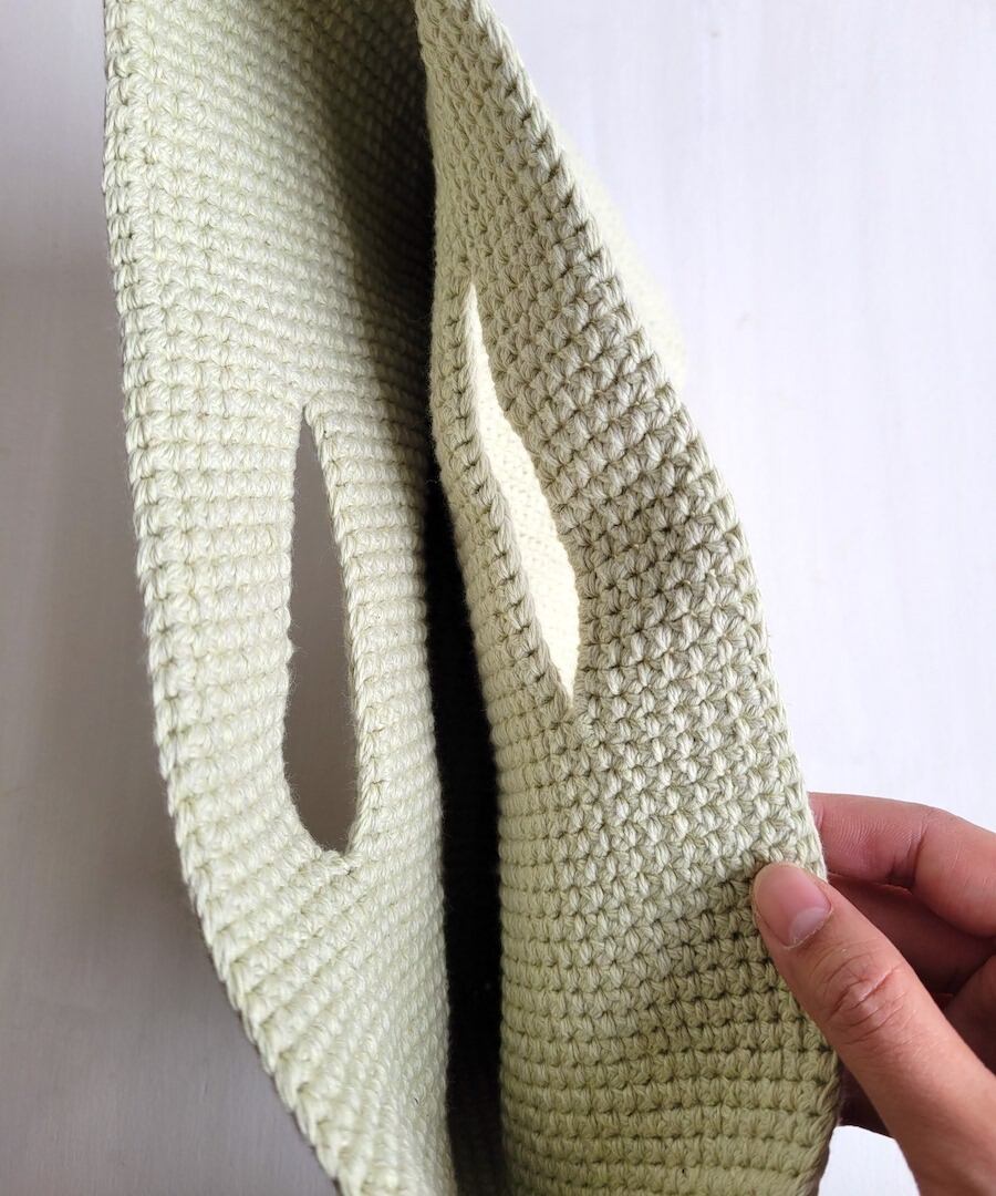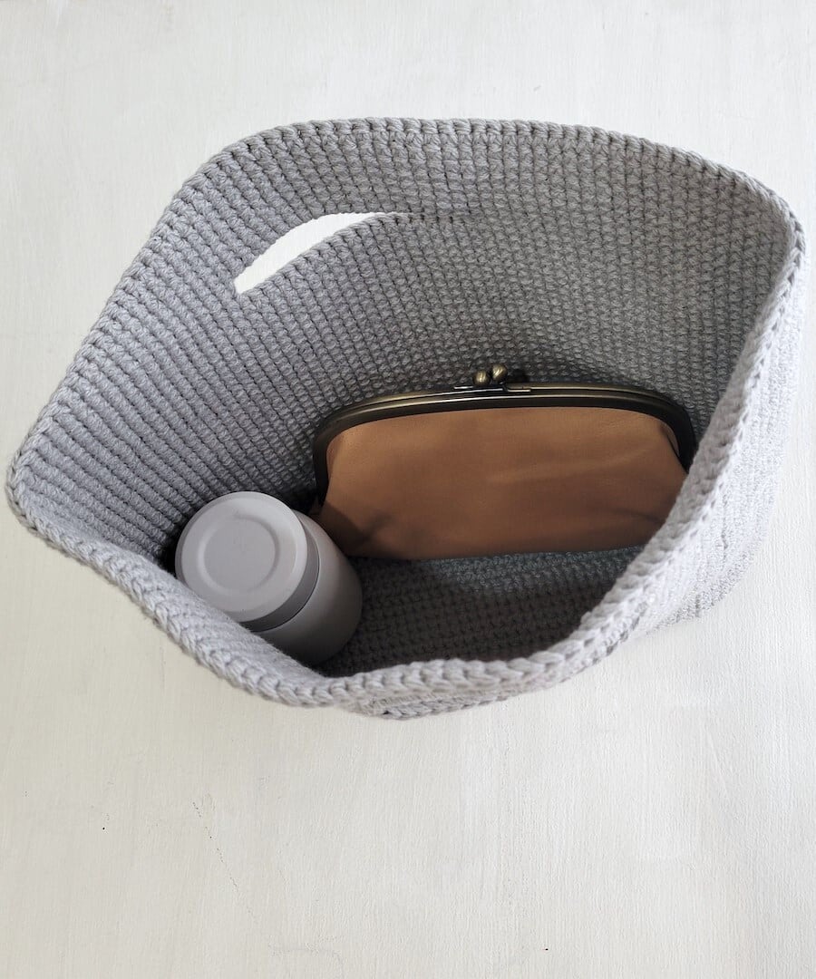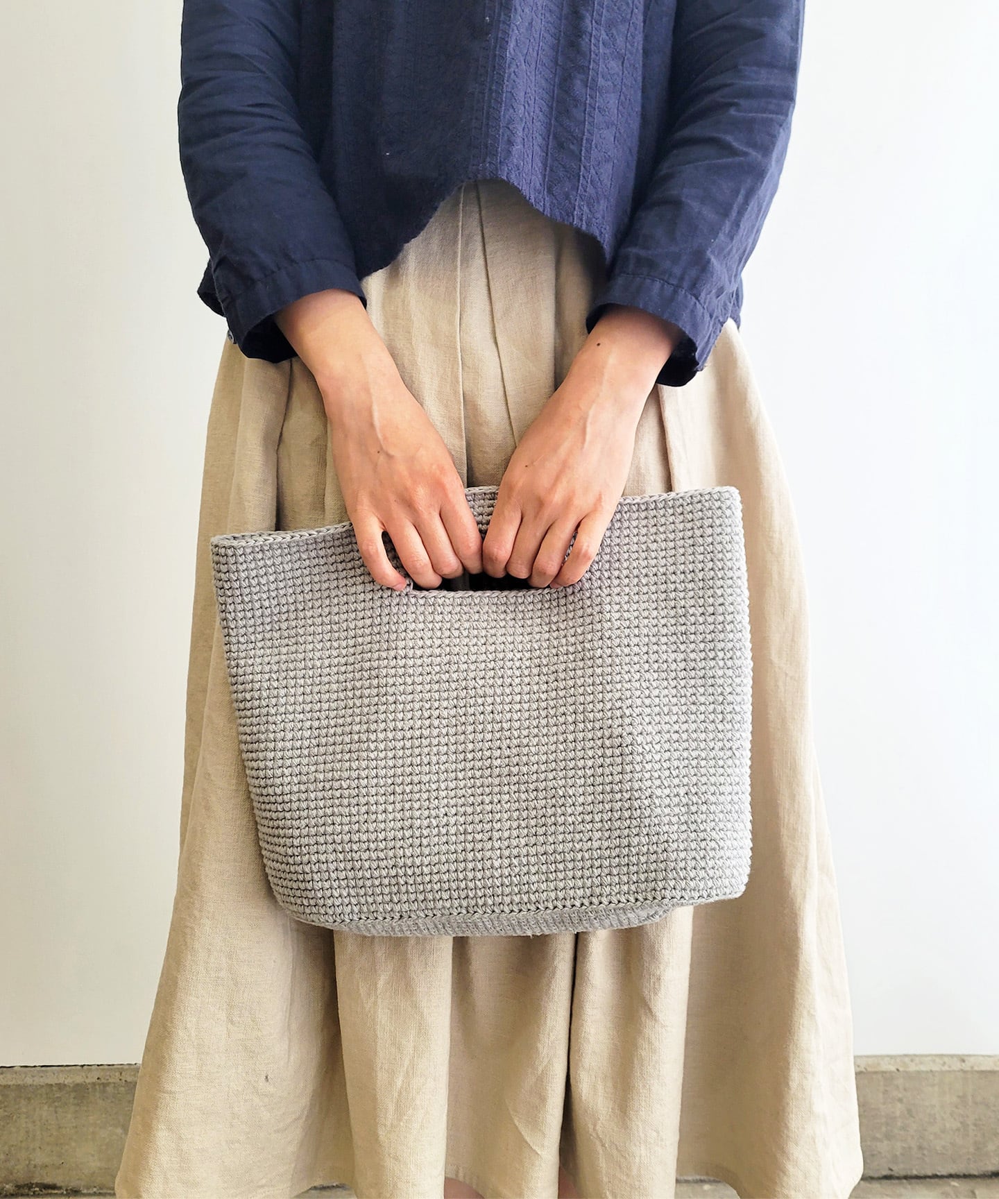 3本取で硬めに細編みで編んでいくので、伸びや型崩れしにくいバッグです。