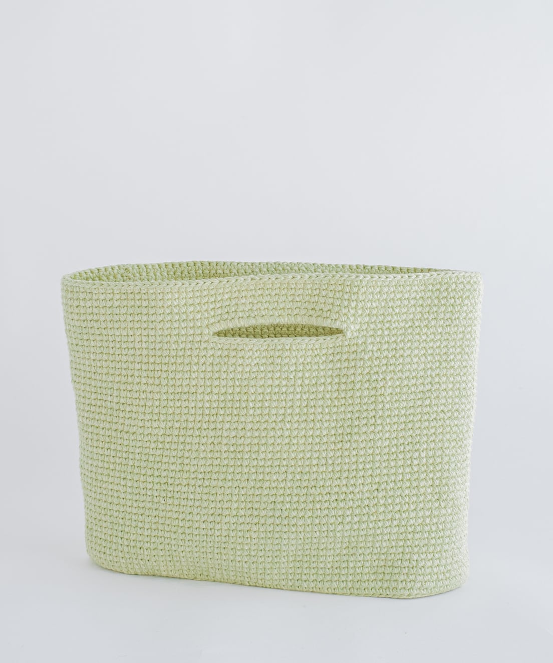細編みできつめに編まないと斜行してしまいますので、持ち手位置がずれてしまう場合は、正面から見て真ん中あたりに穴をあける位置を調整していただければと思います。