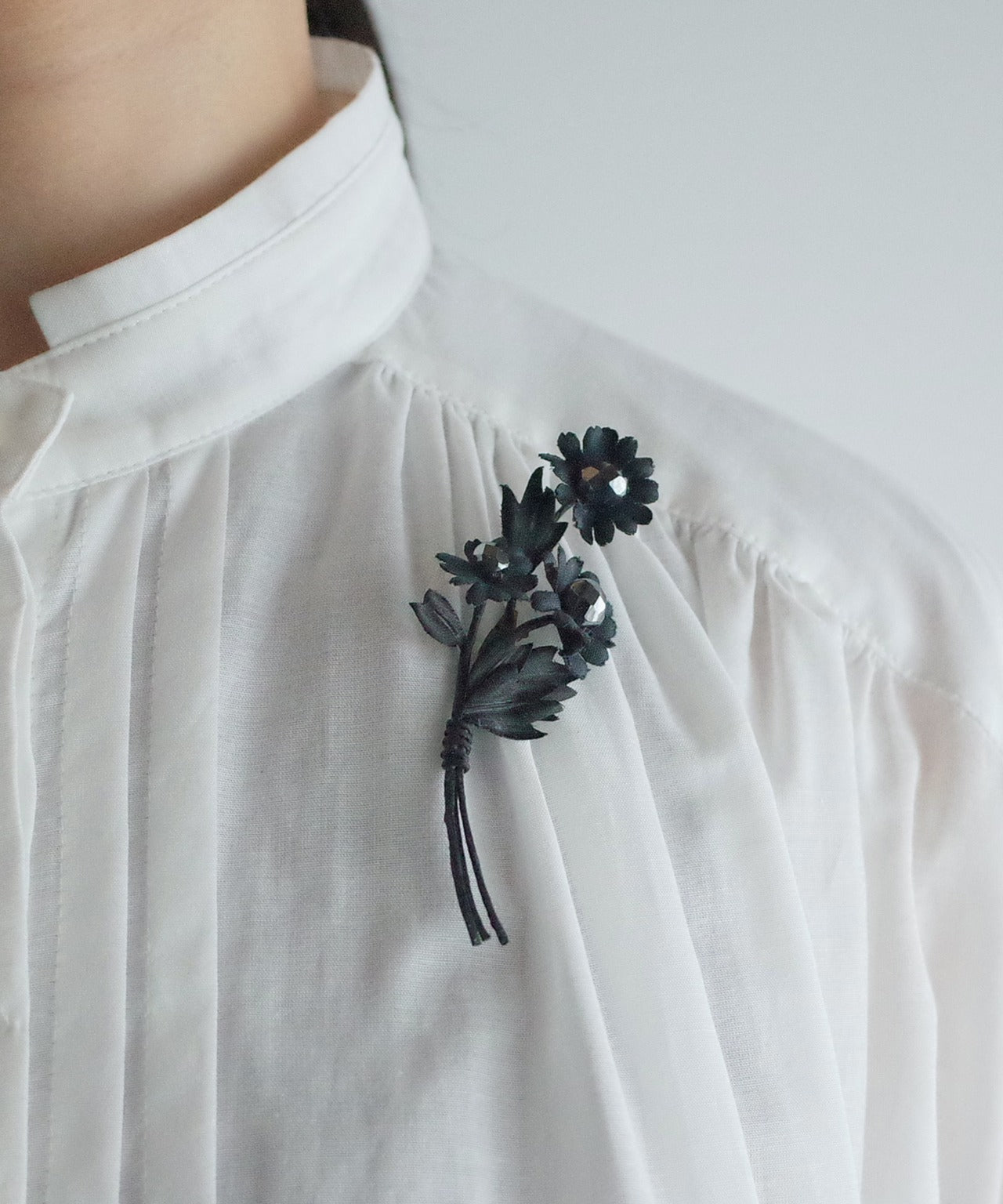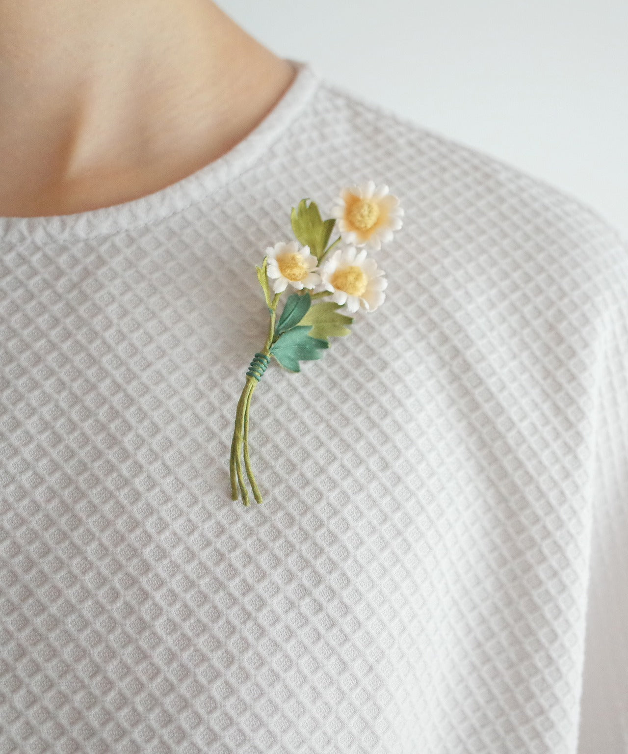繊細ながらも美しい花ブローチは、コディネートを引き締めます。