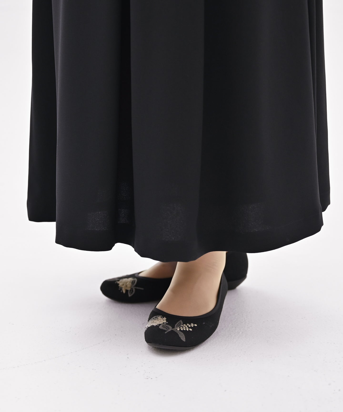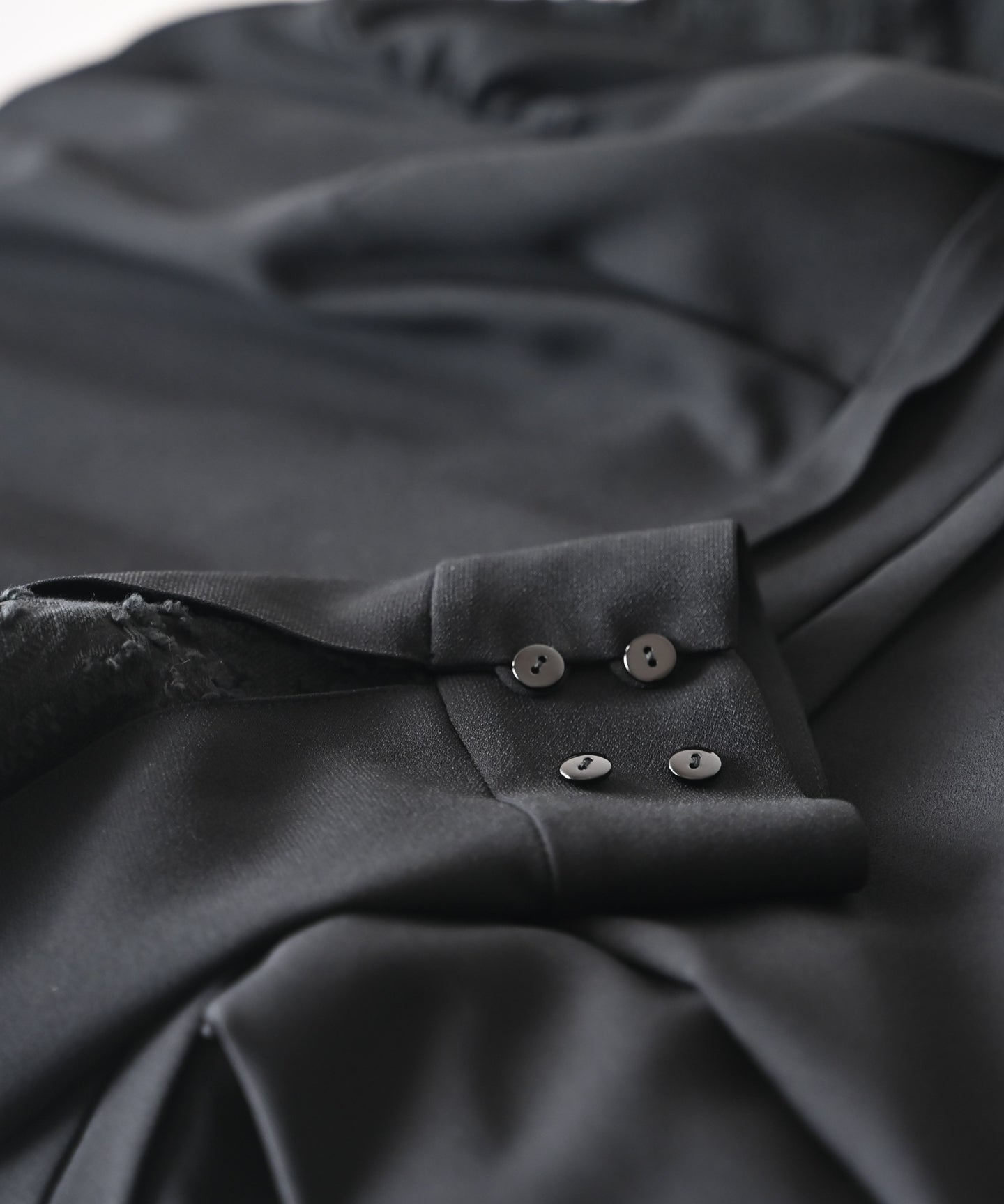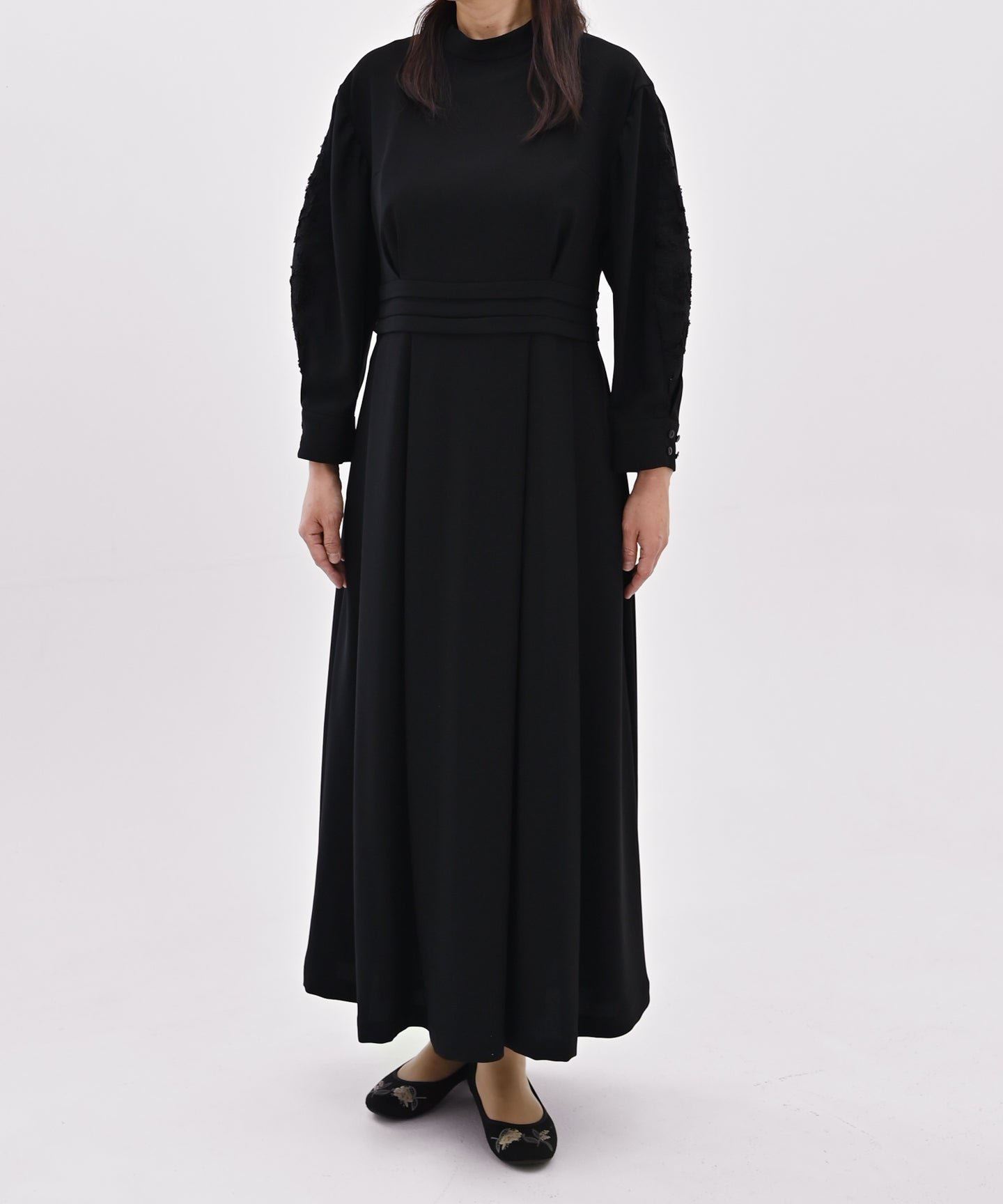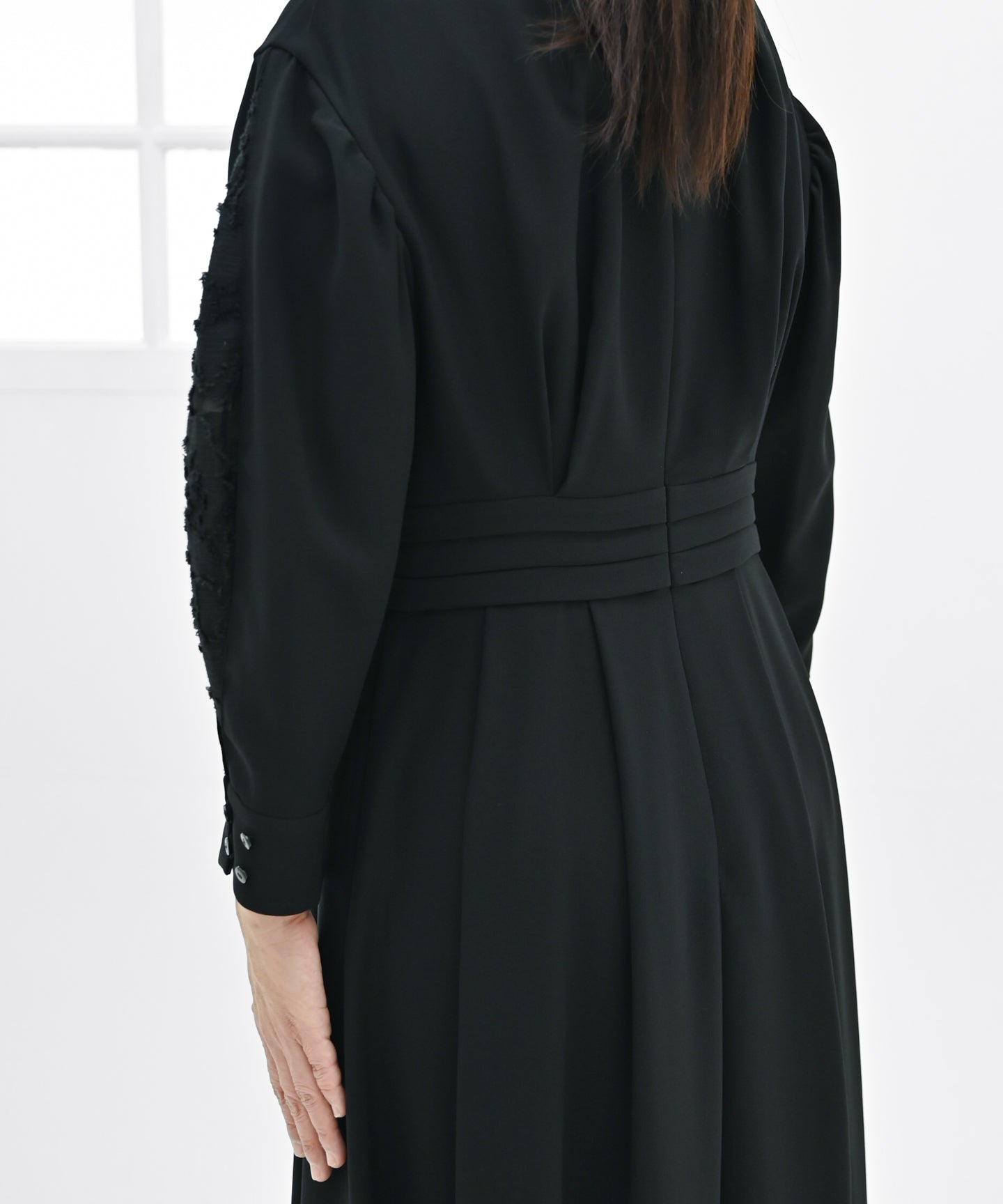 フォーマルシーン、オケージョンシーンのためのちょっと特別なワンピースドレスです。きちんとした食事会や冠婚葬祭などで着ていただける、クラシカルなデザインの一枚です。足のラインもカバーする丈感なので、様々な年齢や体型の方に着ていただけます。