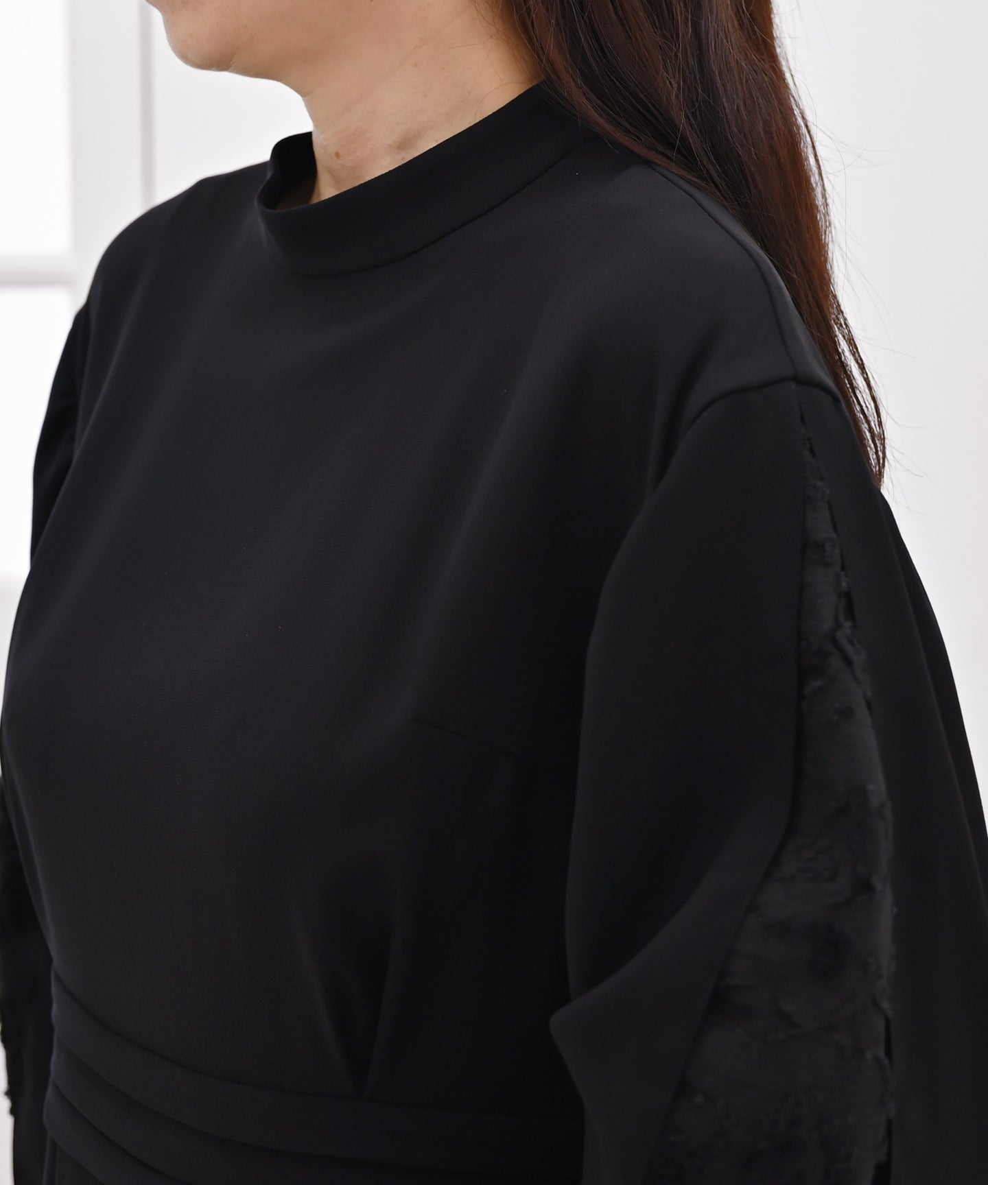 左右にポケット有り、後ろにファスナー有り、袖は裏地無し、身頃には裏地が御座います。身頃部分は共生地で、スカート部分の裏地はメッシュ素材なので春夏時期でも涼しくご着用いただけます。袖から袖口にかけ、カットジャカード素材の切り替えがあり、少し透け感がある花柄生地が覗くのが特長です。二段階で調節ができる袖口はシェルボタンを使用し、よりエレガンスな印象を演出します。