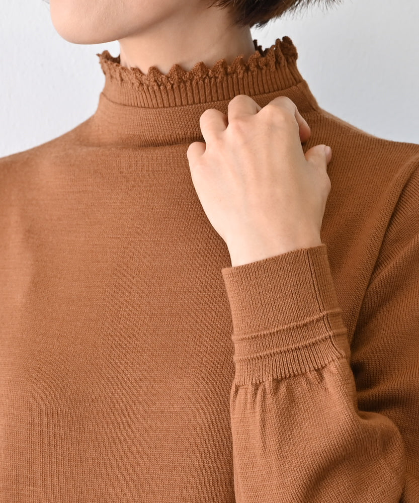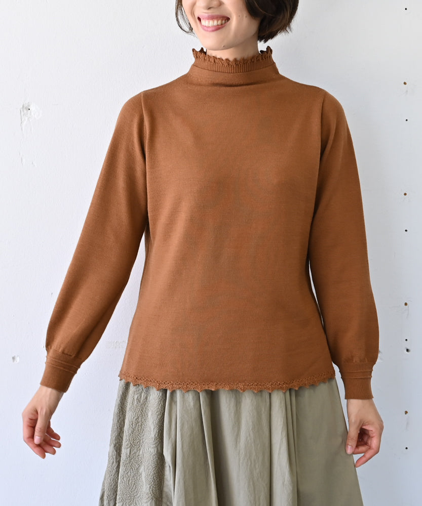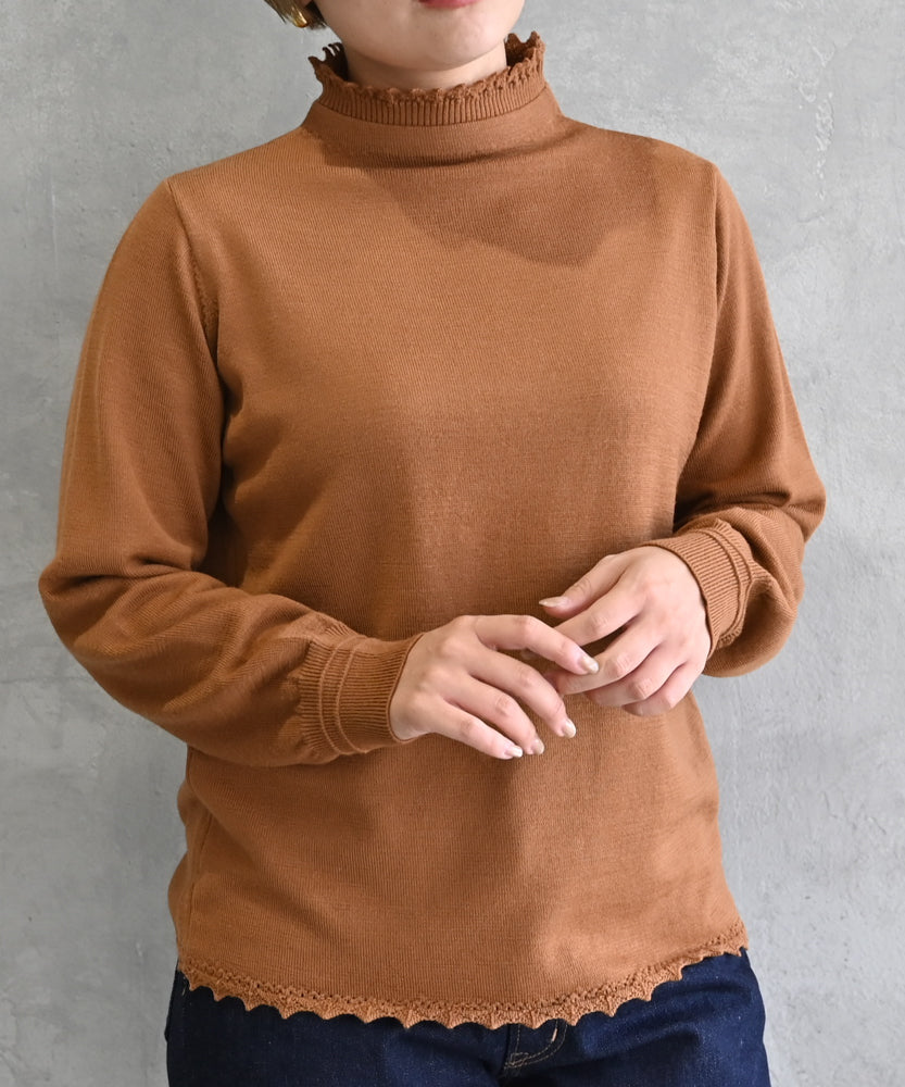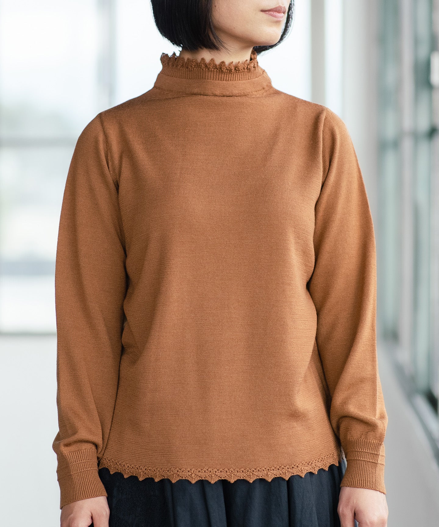 〈極細繊維ウール〉〈高品質スーパー120S極細ウールニット〉〈お家で洗えるニット〉レース編みハイネックプルオーバー (muc916)