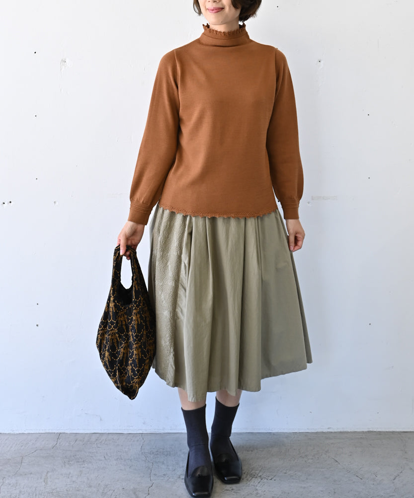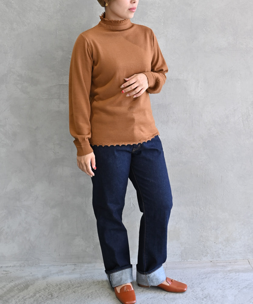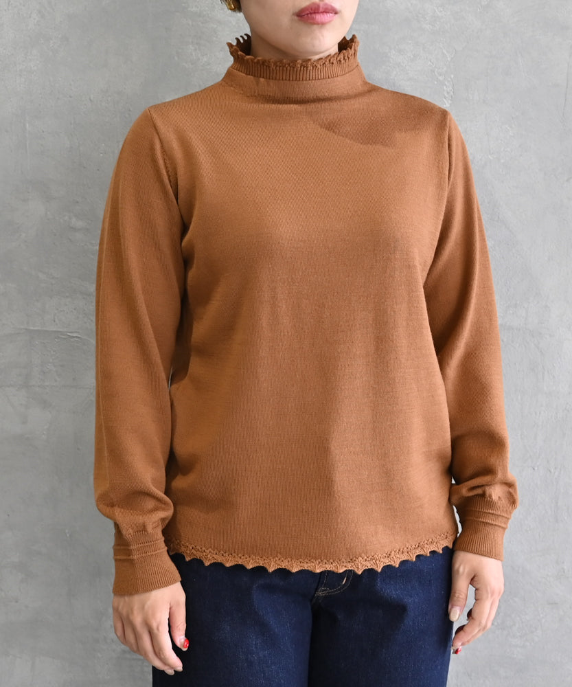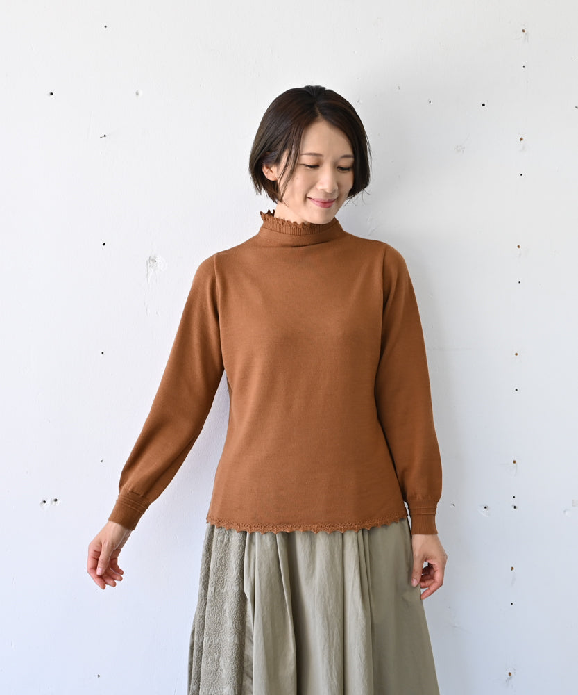 〈極細繊維ウール〉〈高品質スーパー120S極細ウールニット〉〈お家で洗えるニット〉レース編みハイネックプルオーバー (muc916)