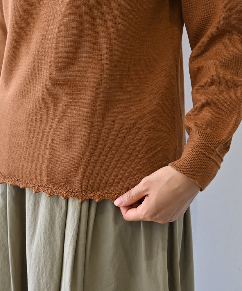 一枚でトップスとしてももちろん、ジャケットやワンピースのインナーとしても着ていただけます。襟や裾は繊細なレース編みにしていますので、シャツやワンピースの襟元から覗かせるスタイリングもお勧めです。