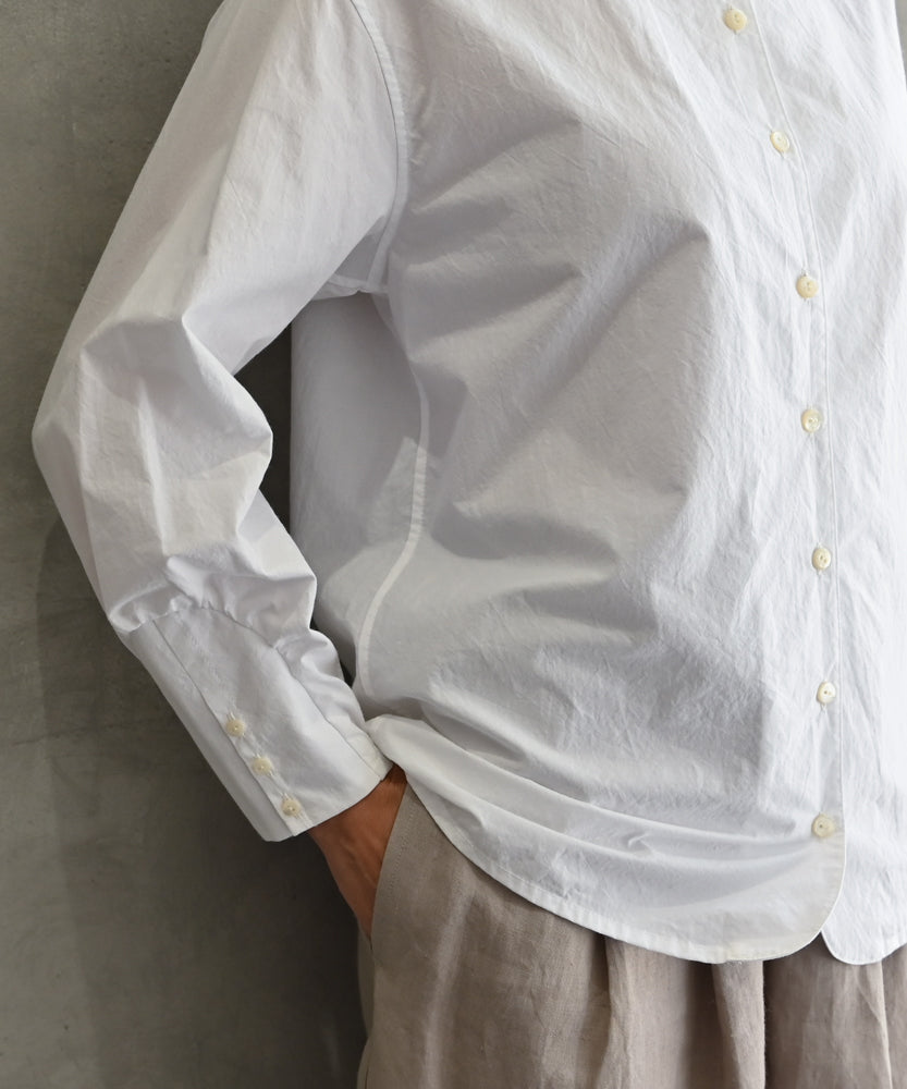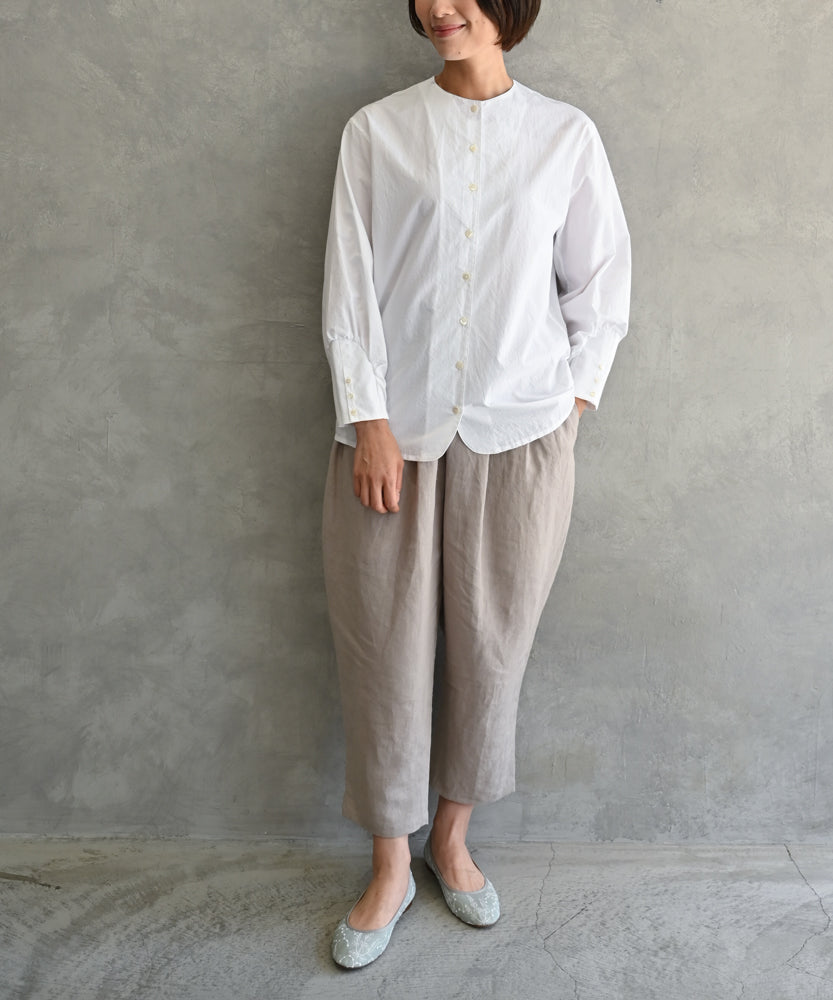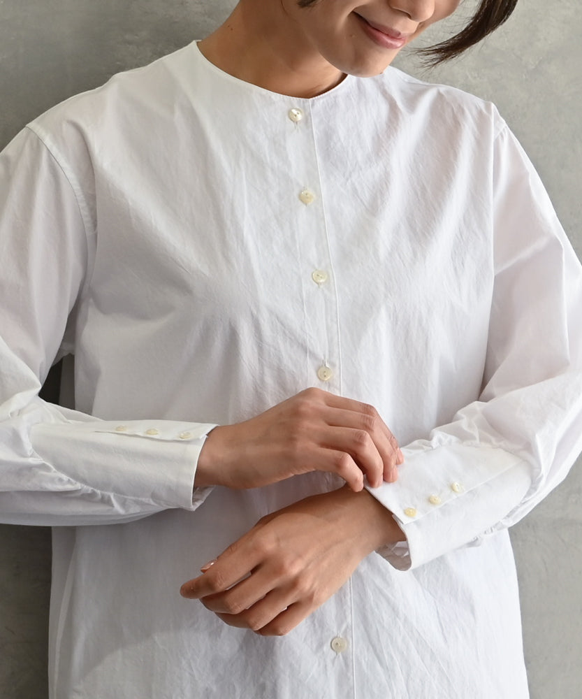 〈遠州織物の工場で織られた上質なコットン生地〉〈通年着られる〉カフスデザイン袖ノーカラーブラウス (mud109)
