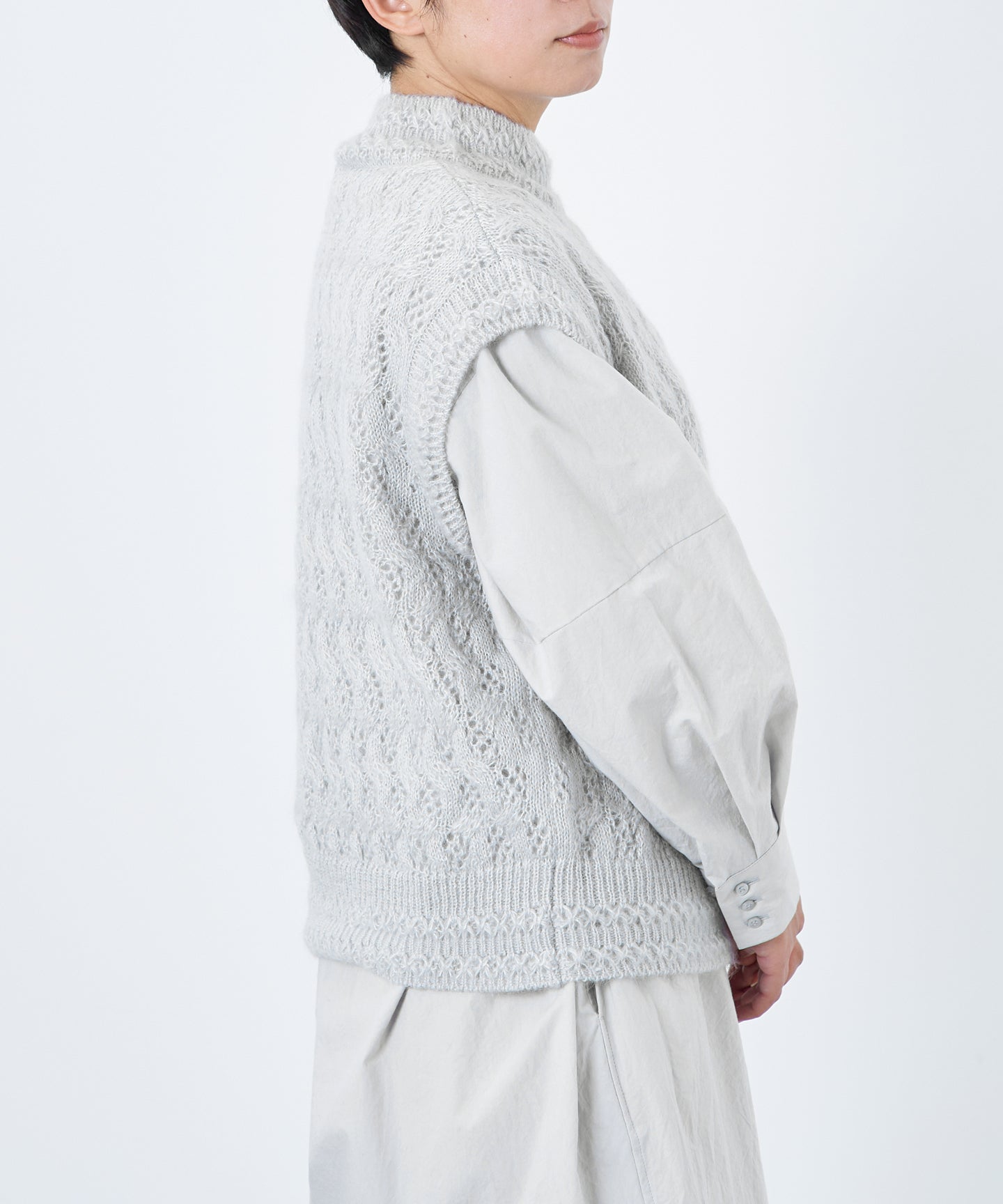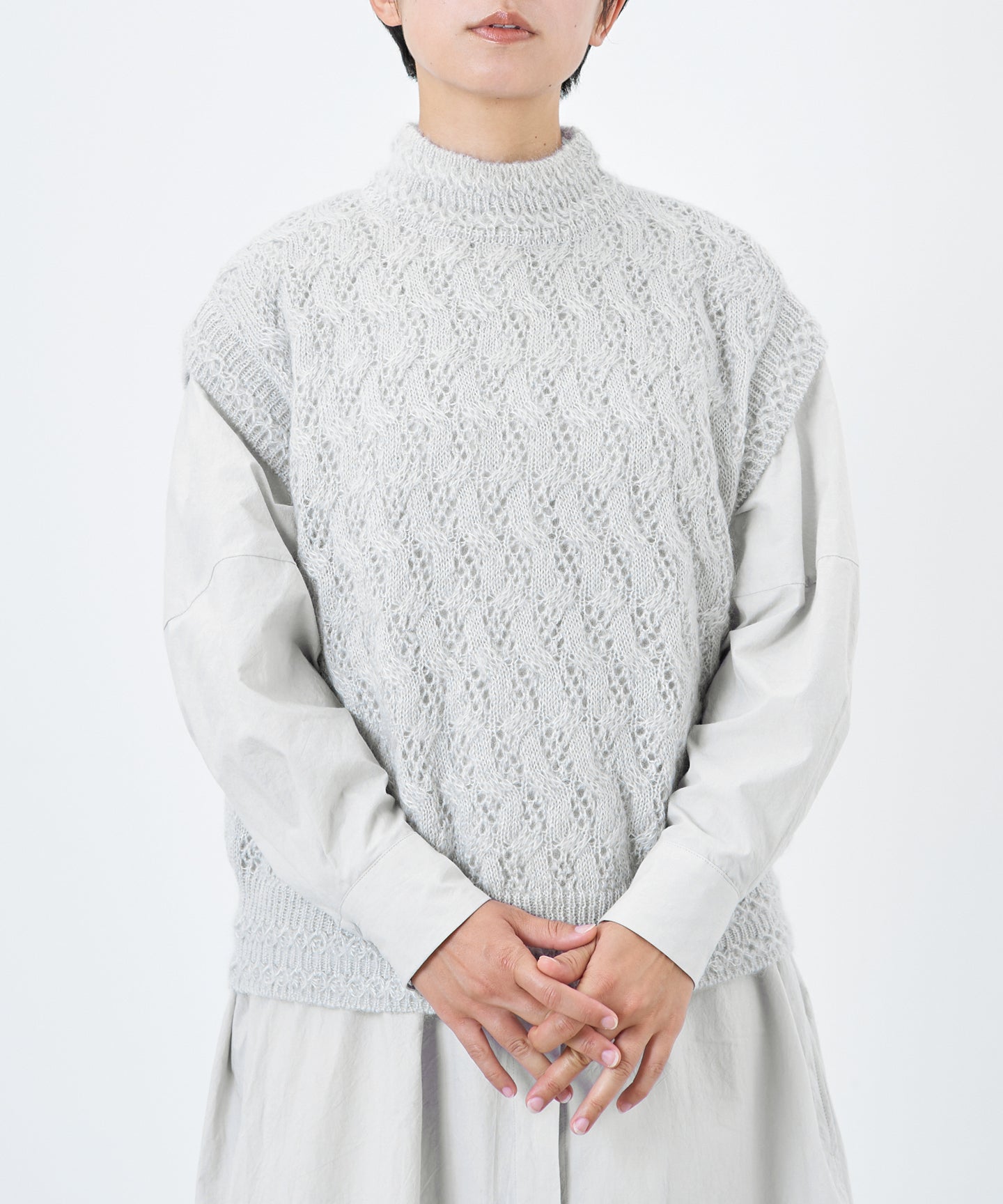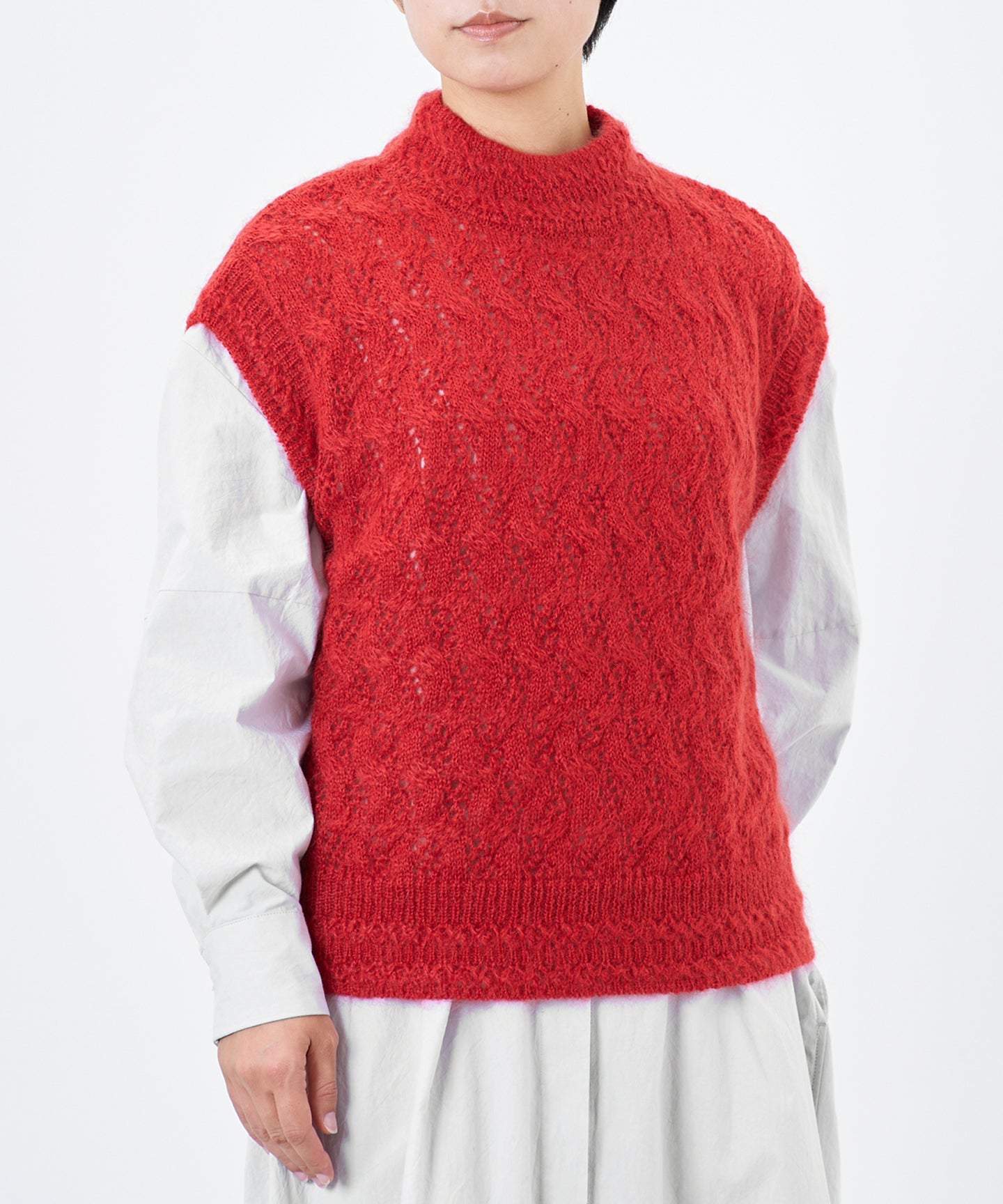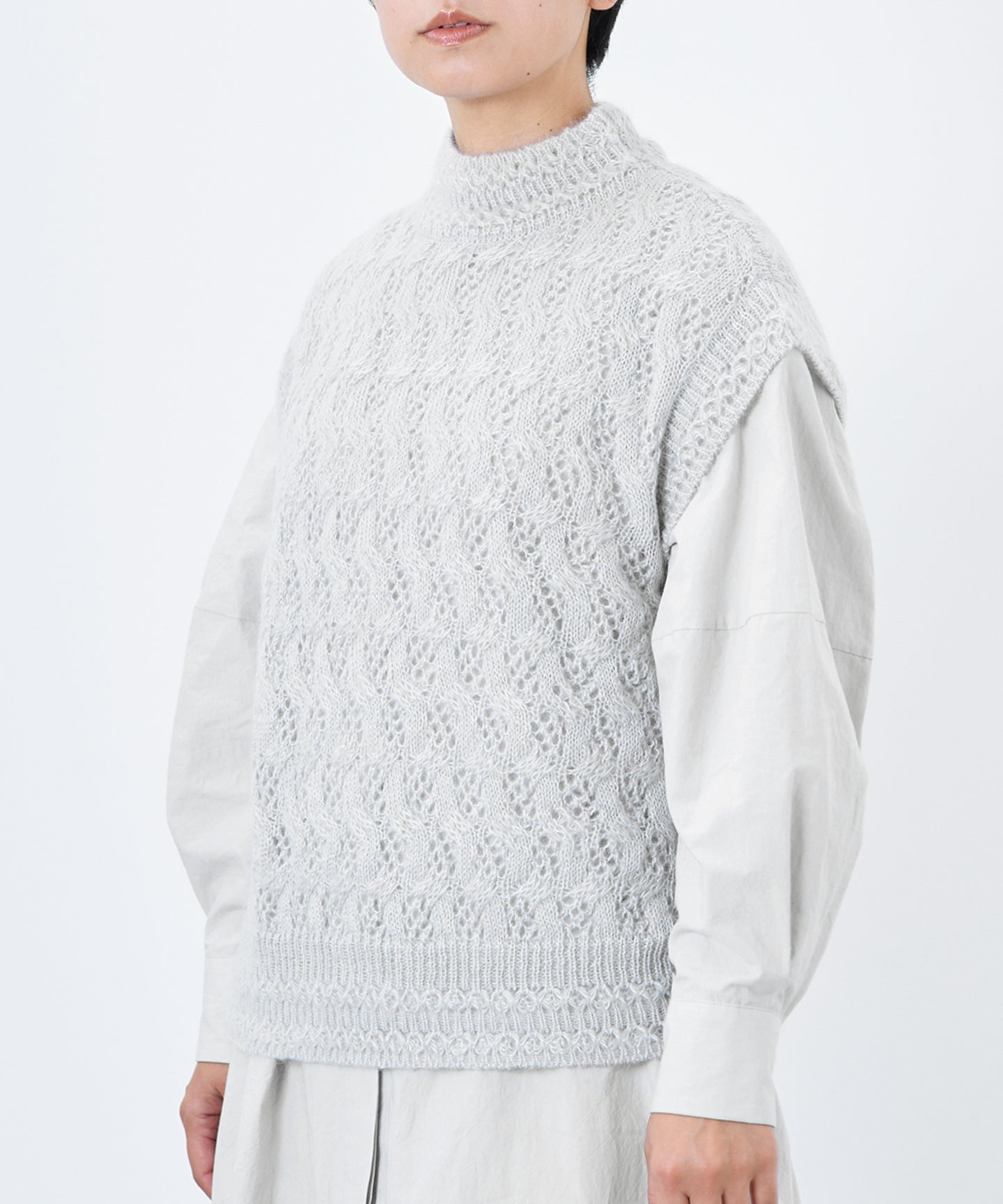 〈高品質シルク&アンゴラ山羊モヘヤ〉模様編み ボトルネックベスト (mug916)