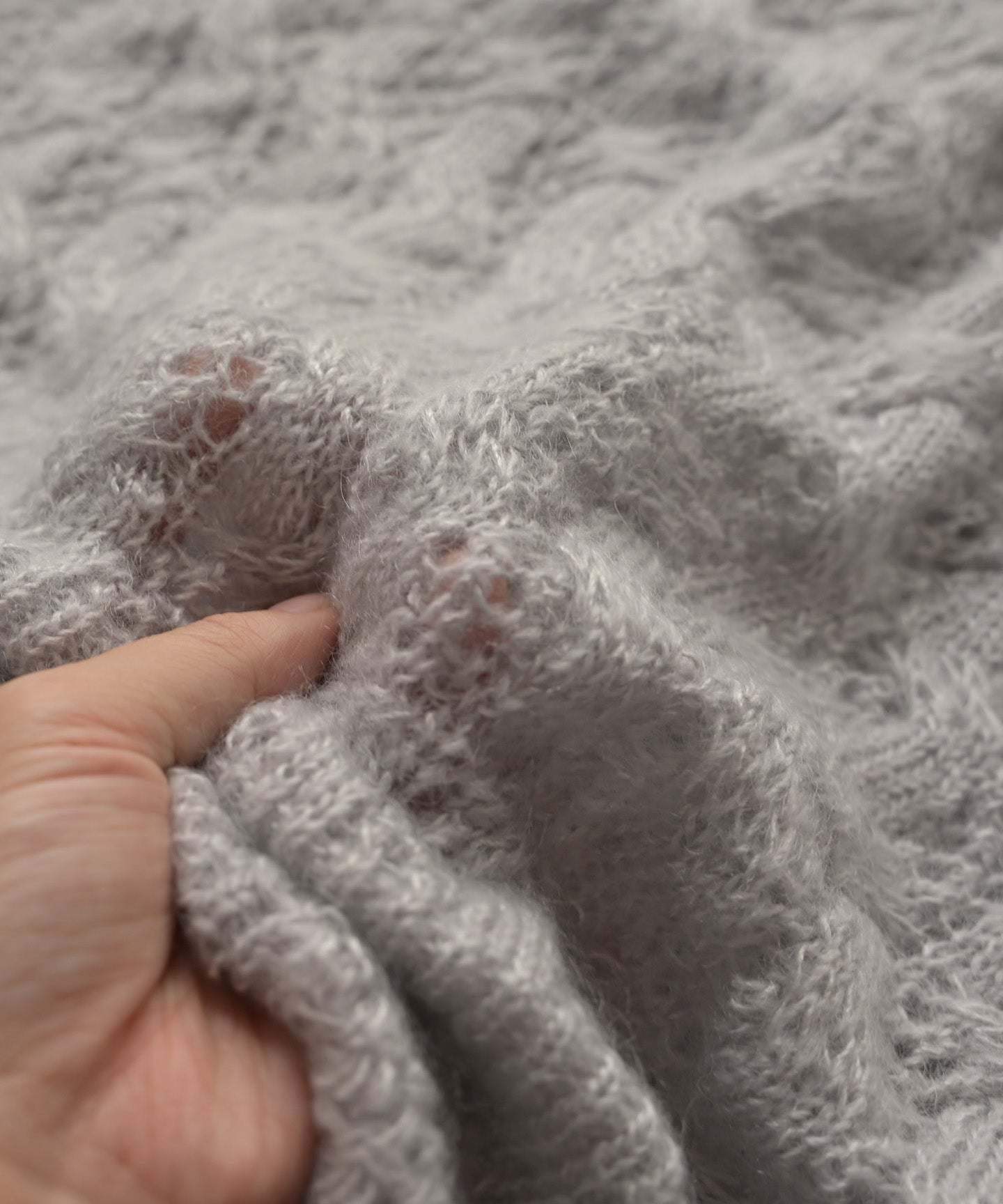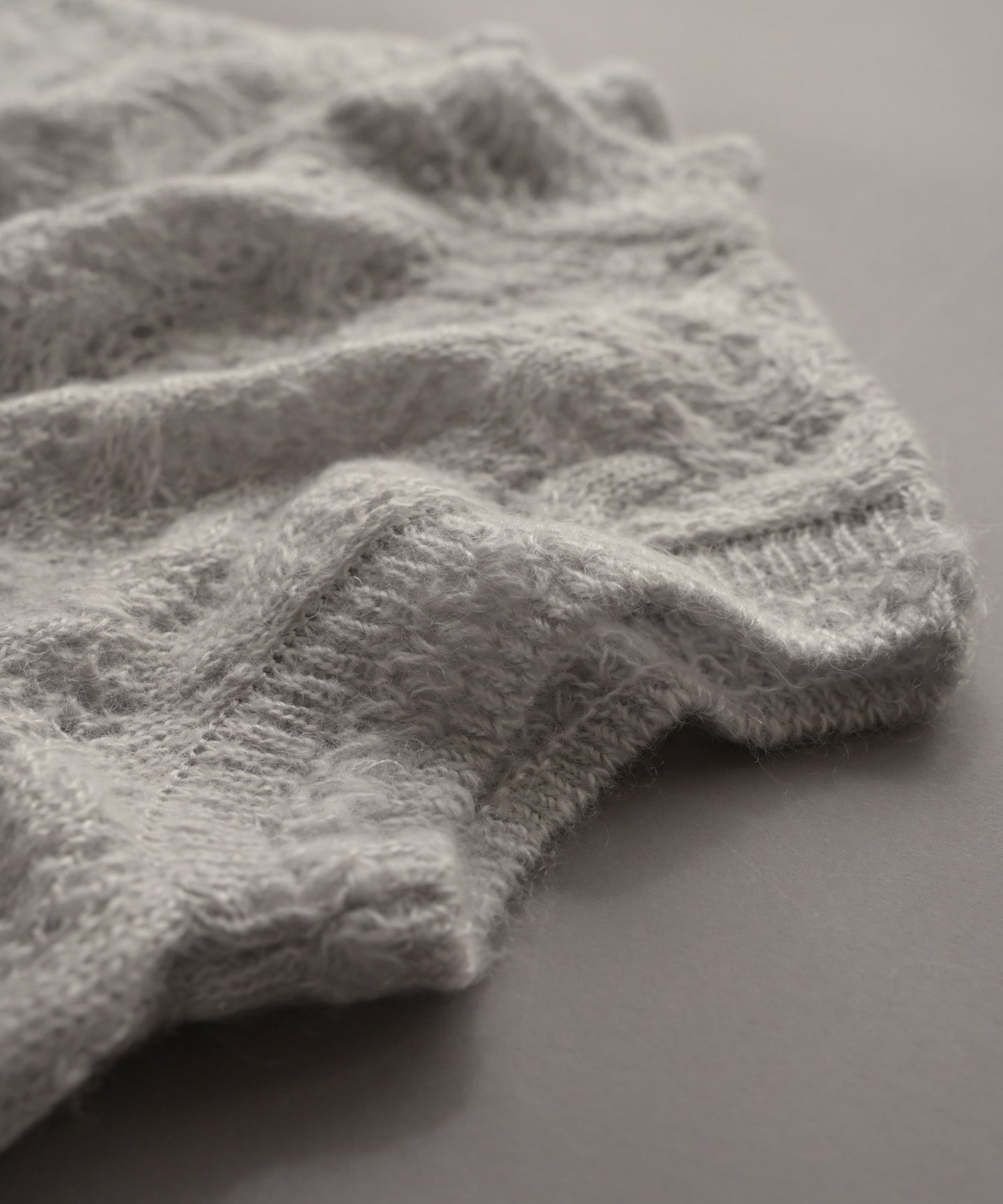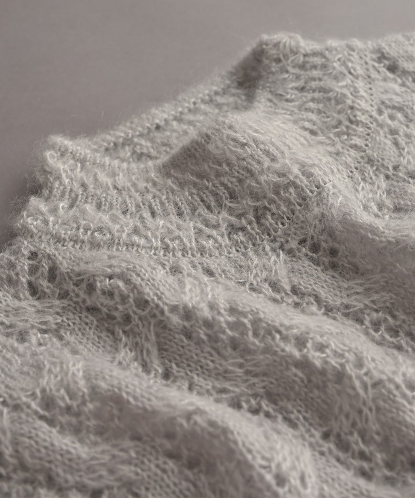 モコモコとしやすいモヘア素材をすっきりとした編み方ですが抑えられて、甘すぎない大人の印象に仕上がりました。