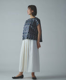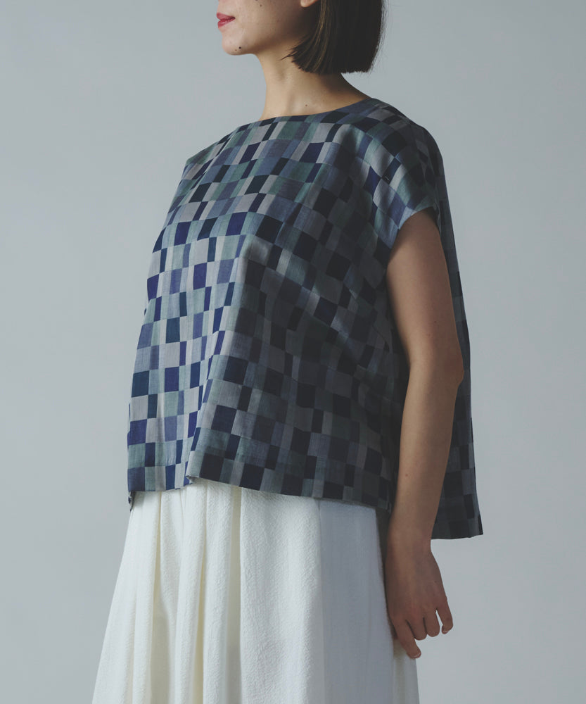 七色の糸を使い分けて重ねることにより、豊かな表情の格子柄模様を作り出しました。かぶって着るタイプのプルオーバーです。身頃にゆとりがたっぷりあり様々な体型の方に着ていただけます。フレンチスリーブにしてはやや長めの袖丈なので、二の腕のラインを綺麗にカバーします。リラクシーに着れつつ、それでいて衿やまわりがコンパクトなデザインのため綺麗見えを叶え、カジュアルになり過ぎず上品な印象になる、大人の夏服です。