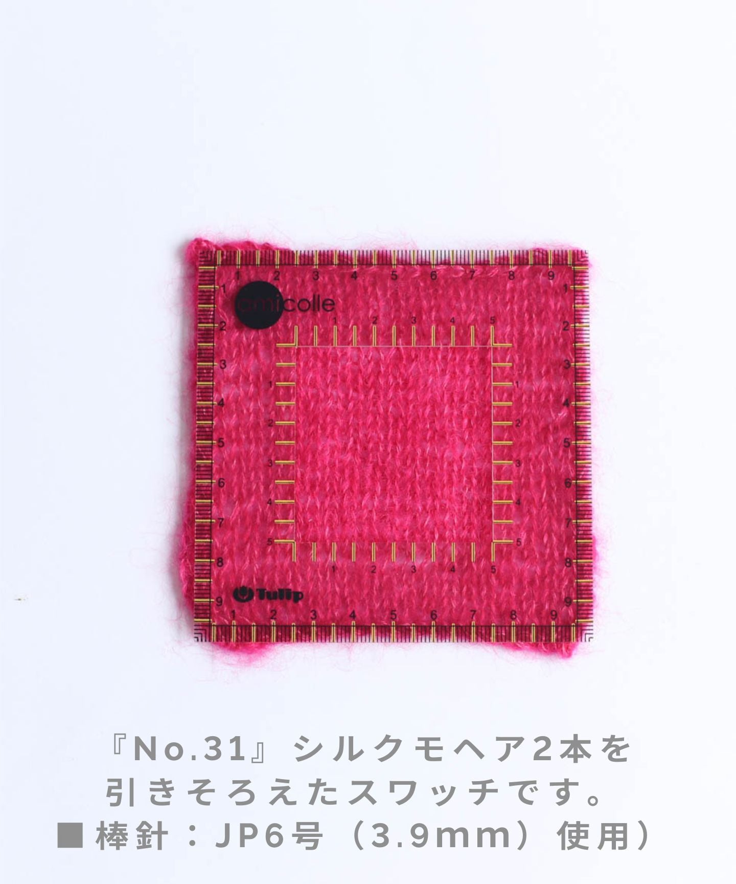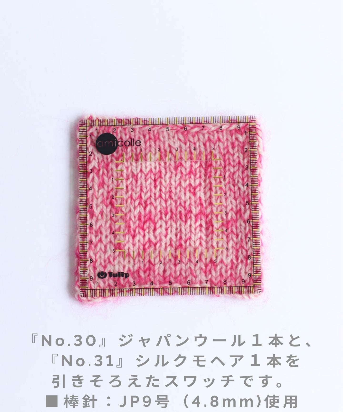 モヘア調の毛足の長い糸なので、表記の使用道具の号数より大きめの針を使用して柔らかさを生かして編むのもお勧めです。